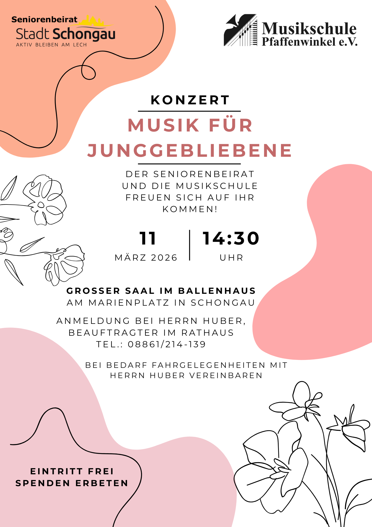 Der Seniorenbeirat Schongau und die Musikschule Pfaffenwinkel laden Euch sehr herzlich zu einem Konzert für Junggebliebene am 11. März 2026 um 14:30 Uhr ein.